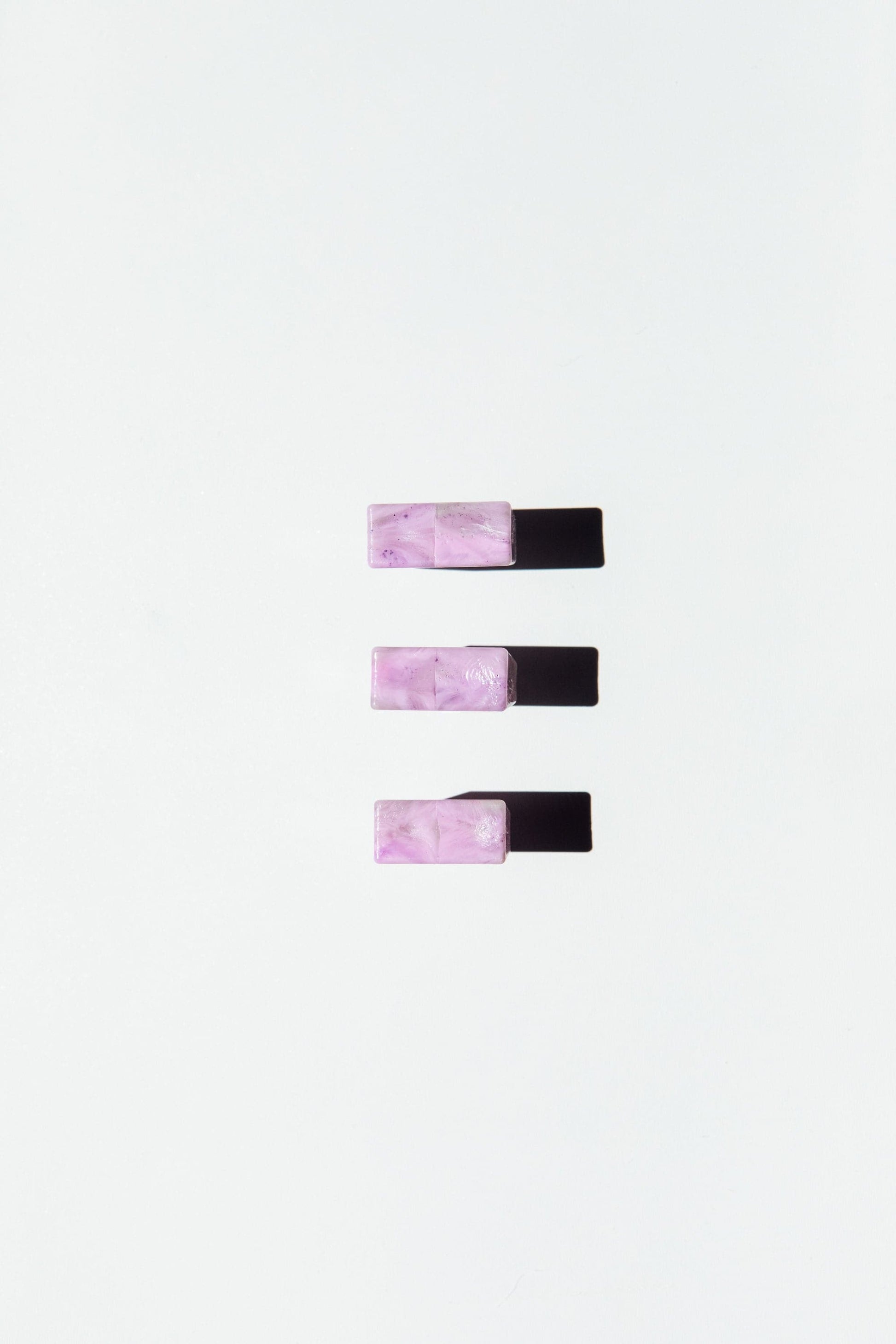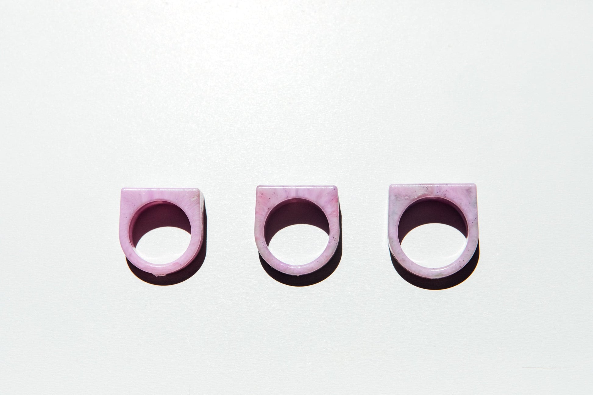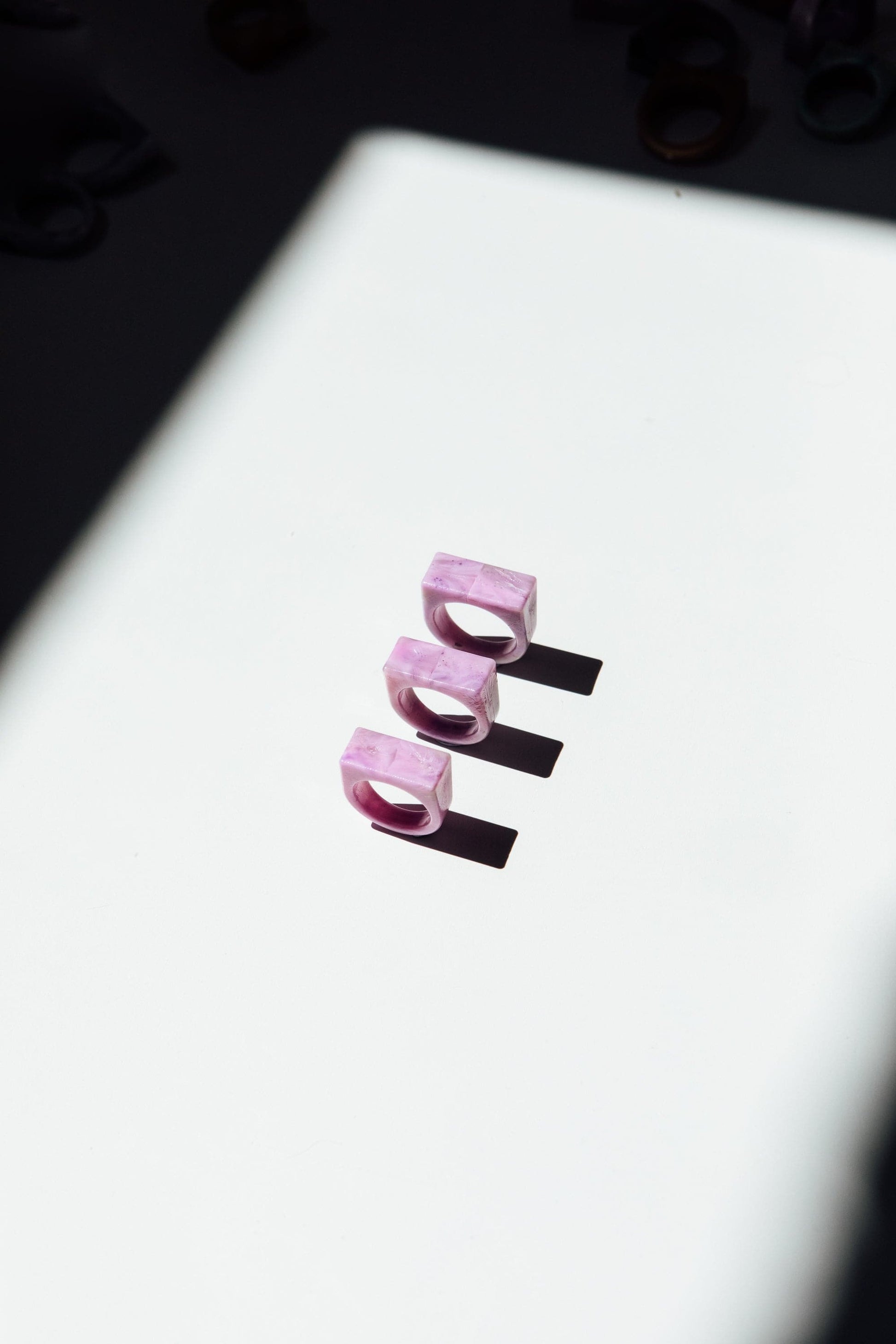 This lilac blend has been created with two main types of plastic waste, the first is baby food lids, and the second Calpol syringes. We sprinkle in a little bit of white (Heinz bottle lids) to create a ripple effect.