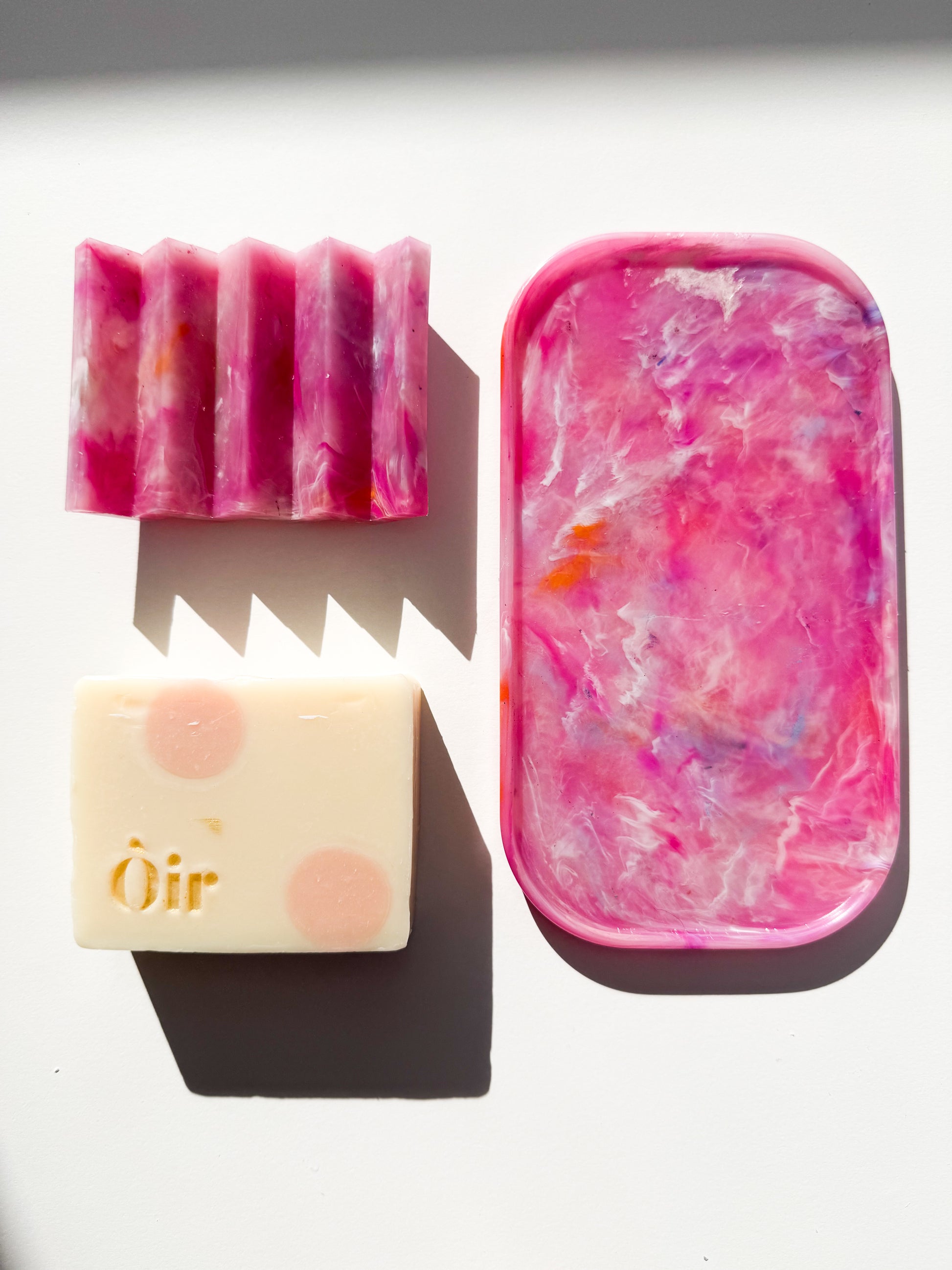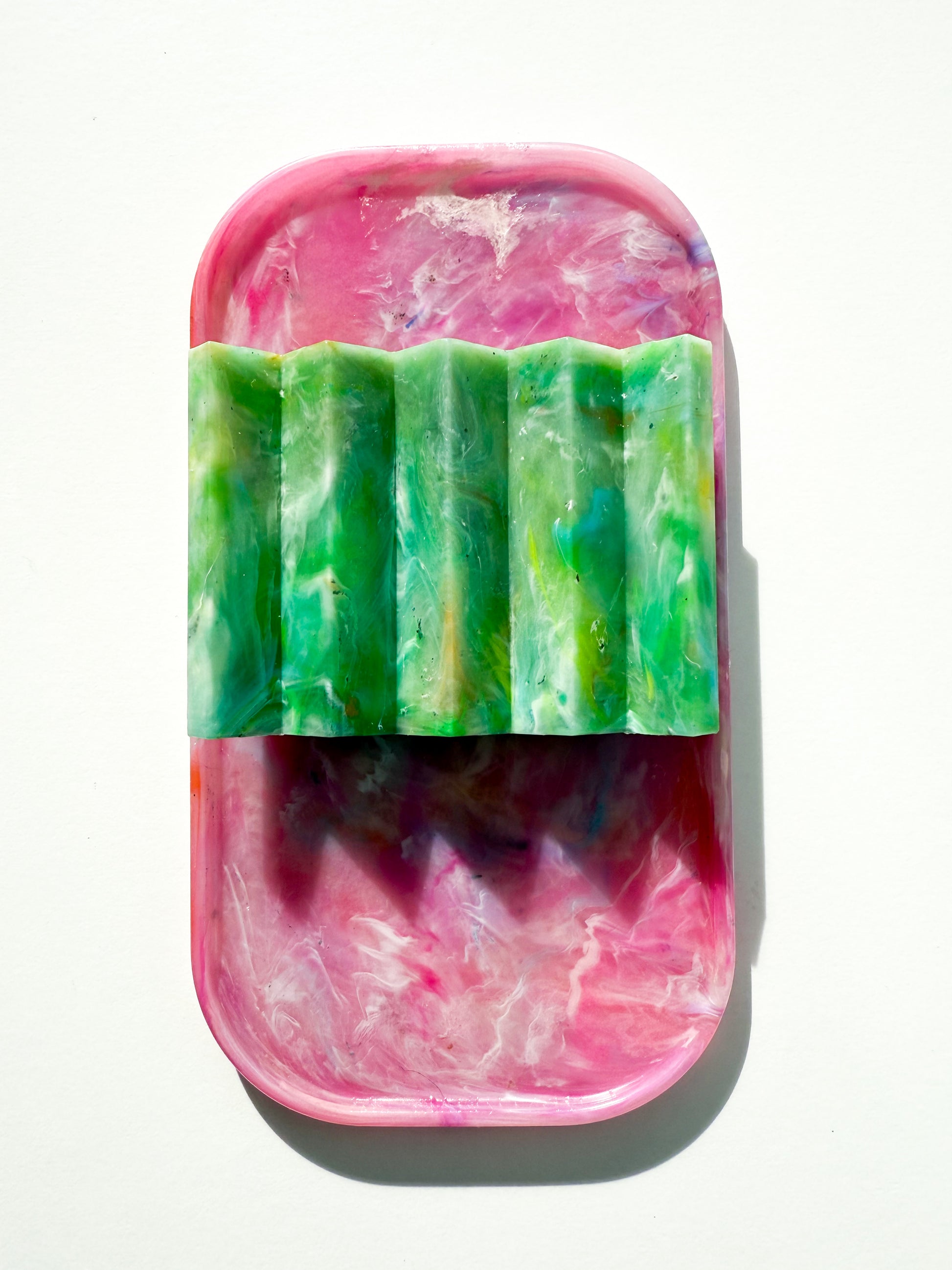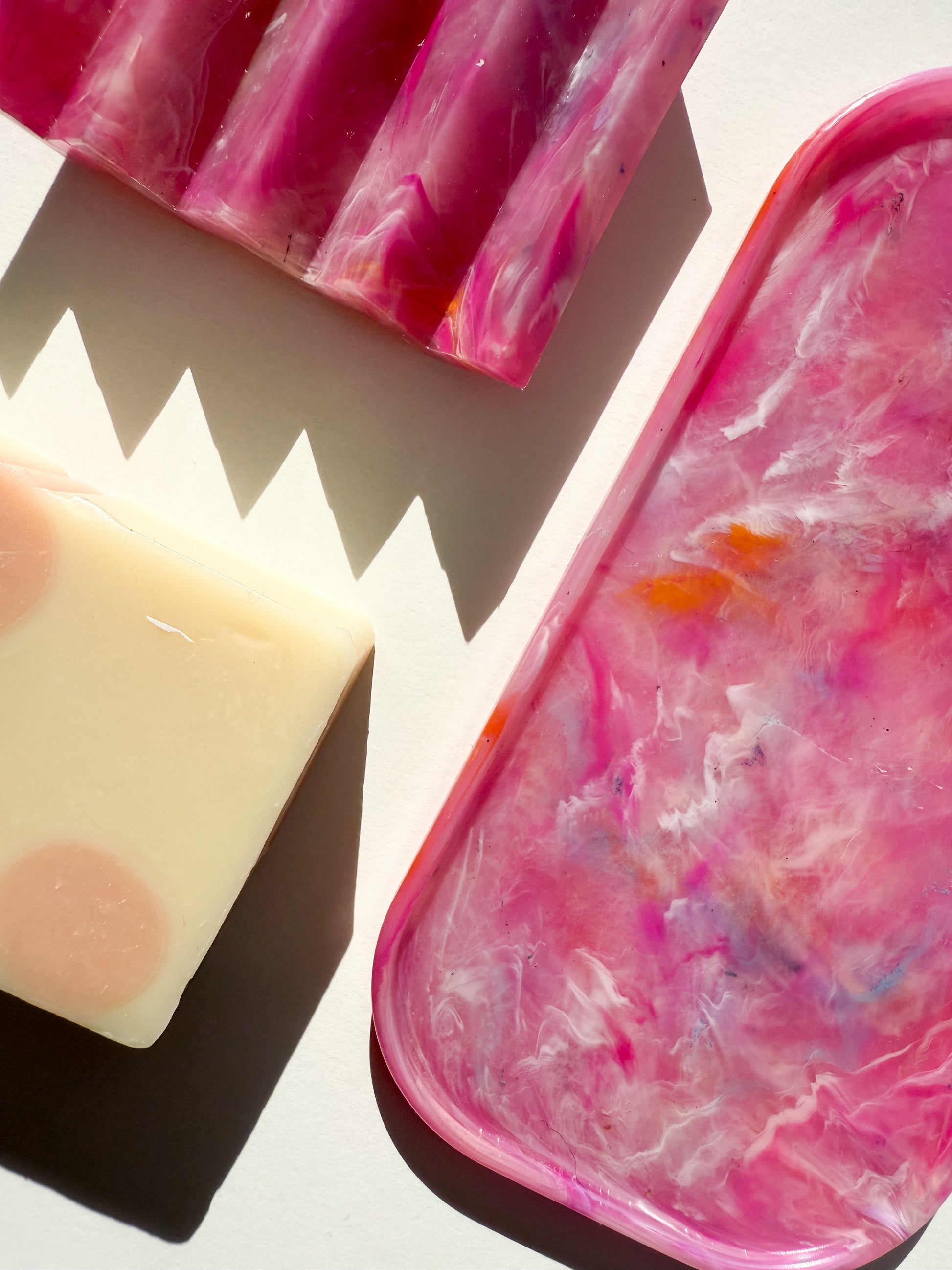 Colourway Description: The Van'ish blend features plastics from Vanish tubs, LOL doll containers, and yogurt pots, resulting in a striking mix of pink, orange, and yellow. This cheerful colour combination creates a vibrant and unique pattern in every piece, making each tray a one-of-a-kind product that showcases the beauty of recycled materials.